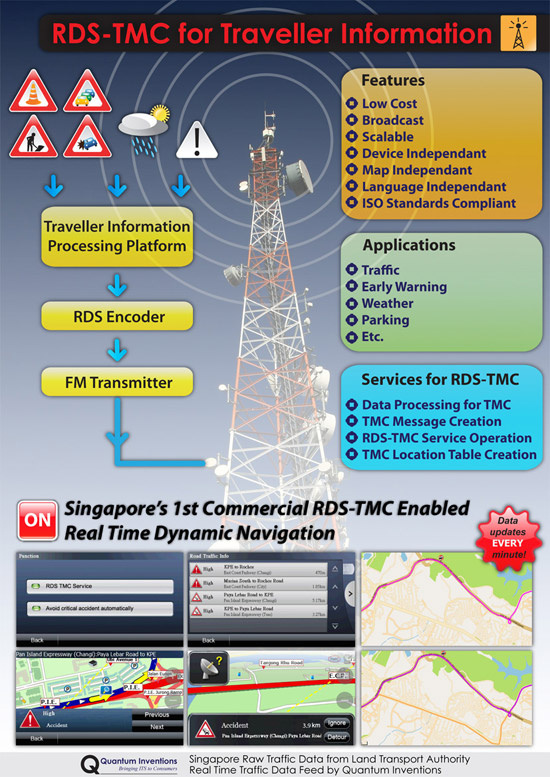 Currently, the available navigational systems in the market only allow motorists to pin point their location on a map, plan driving routes, and in some systems also show traffic information in graphic format. This means that the route chosen by these systems are not influenced by actual real time traffic conditions. With RDS-TMC, drivers will now be able to receive actual “real-time” traffic information from Traffic Information Platform (TRIP) a platform developed by Land Transport Authority (LTA) in partnership with Quantum Inventions Pte Ltd (QI), in their Personal Navigation Devices (PND).